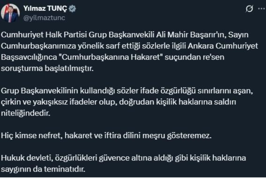 Sosyal medya hesabından açıklama yapan Tunç, "Cumhuriyet Halk Partisi Grup Başkanvekili Ali Mahir Başarır'ın, Sayın Cumhurbaşkanımıza yönelik sarf ettiği sözlerle ilgili Ankara Cumhuriyet Başsavcılığınca "Cumhurbaşkanına Hakaret" suçundan re'sen soruşturma başlatılmıştır" dedi.