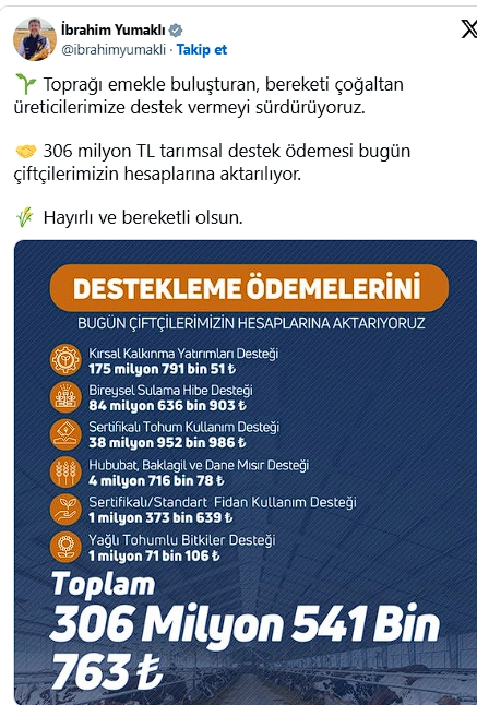 Bakan Yumaklı, sosyal hesabından yaptığı paylaşımda, tarımsal destekleme ödemelerine ilişkin bilgi verdi.