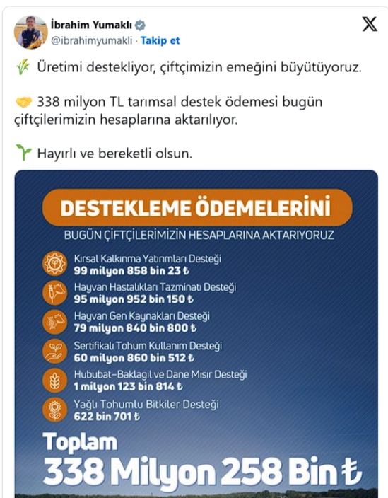 Bakan Yumaklı, sosyal medya hesabından tarımsal destekleme ödemelerine ilişkin bilgi vererek “üretimi destekliyor, çiftçimizin emeğini büyütüyoruz” diyerek "338 milyon lira tarımsal destek ödemesi bugün çiftçilerimizin hesaplarına aktarılıyor. Hayırlı ve bereketli olsun." temennisinde bulundu.
