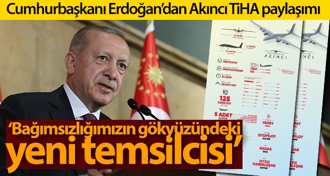 Cumhurbaşkanı Recep Tayyip Erdoğan, pek çok harekatta Türkiye'nin göklerdeki gözü olacak olan "Akıncı TİHA" ile ilgili paylaşım yaptı.