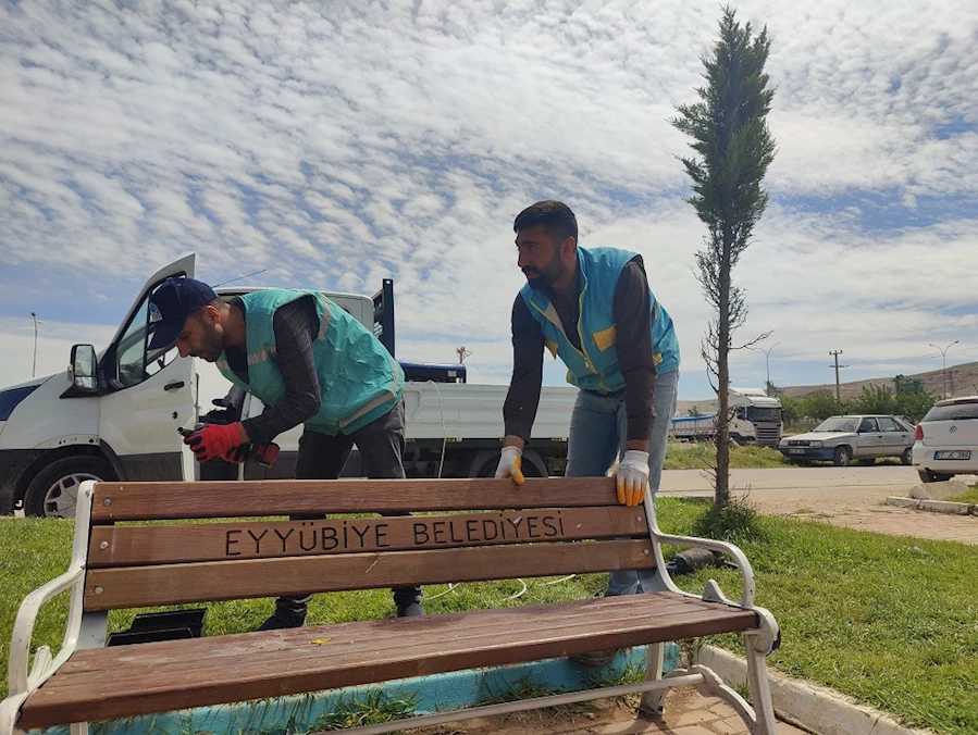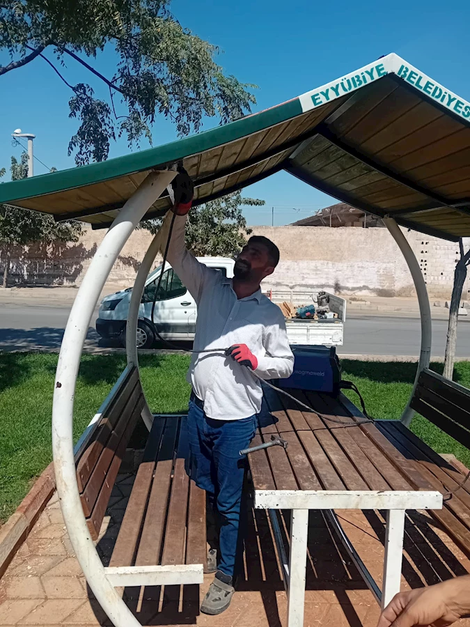 Parkların yapısal peyzajında inşaat atığı taş ve betonları yeniden değerlendirerek çevre korumada büyük bir adım atan Eyyübiye Belediyesi, yine parklarda vatandaşın kullanımına sunulan kamelya, bank, çöp kovası ve benzeri açık hava mobilyalarını da kendi atölyelerinde üretiyor.