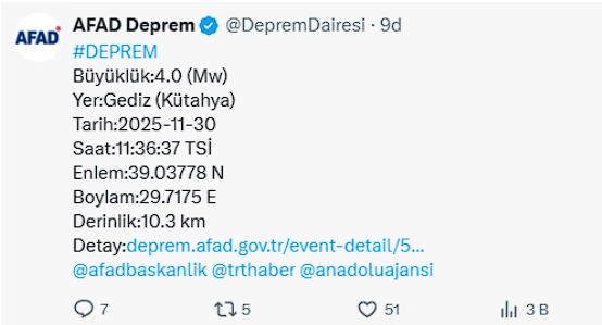 Afet ve Acil Durum Yönetimi Başkanlığının (AFAD) internet sitesinde yer alan bilgiye göre, Kütahya'da merkez üssü Gediz ilçesi olan 4 büyüklüğünde sarsıntı kaydedildi.
