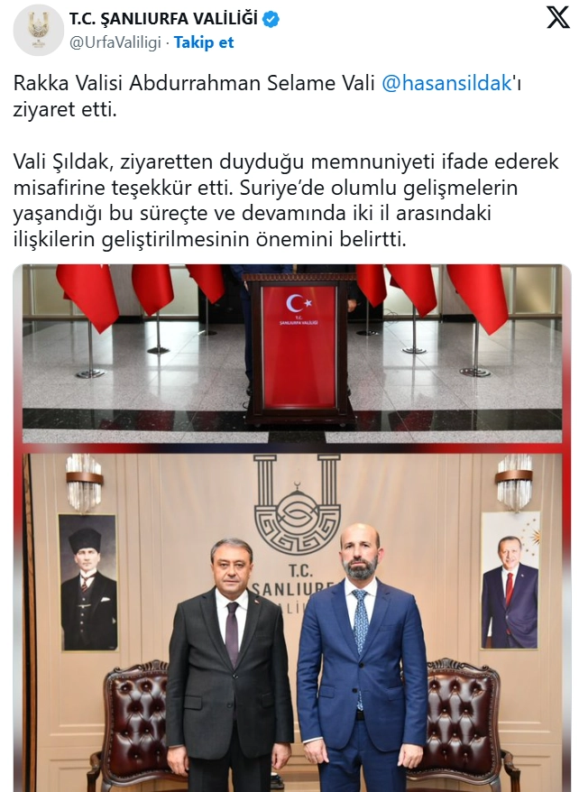 Gerçekleştirilen ziyaret fotoğraf çekimiyle sona ererken Şanlıurfa Valisi Hasan Şıldak sosyal medya hesabında bu açıklamalara yer verdi, “Rakka Valisi Abdurrahman Selame Vali