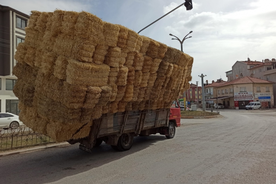 Afyonkarahisar'ın Şuhut ilçesinde saman yüklü kamyonetin sürücülerin hayatını hiçe saydığı görüntüler kameraya alındı. İlçenin en işlek caddesinde görüntülenen bir saman balyası yüklü kamyonet onca sürücünün canını adeta tehlikeye soktu. Kasasındaki saman balyaları yan yatmış vaziyette trafikte ilerleyen kamyonet sürücüsü gerekli önlemleri alması gerekirken hiçbir tedbir almadan trafikte ilerlemeye devam etti. Kamyonetin yan yatmış hali diğer sürücülerin de yürüklerini ağzına getirdi.