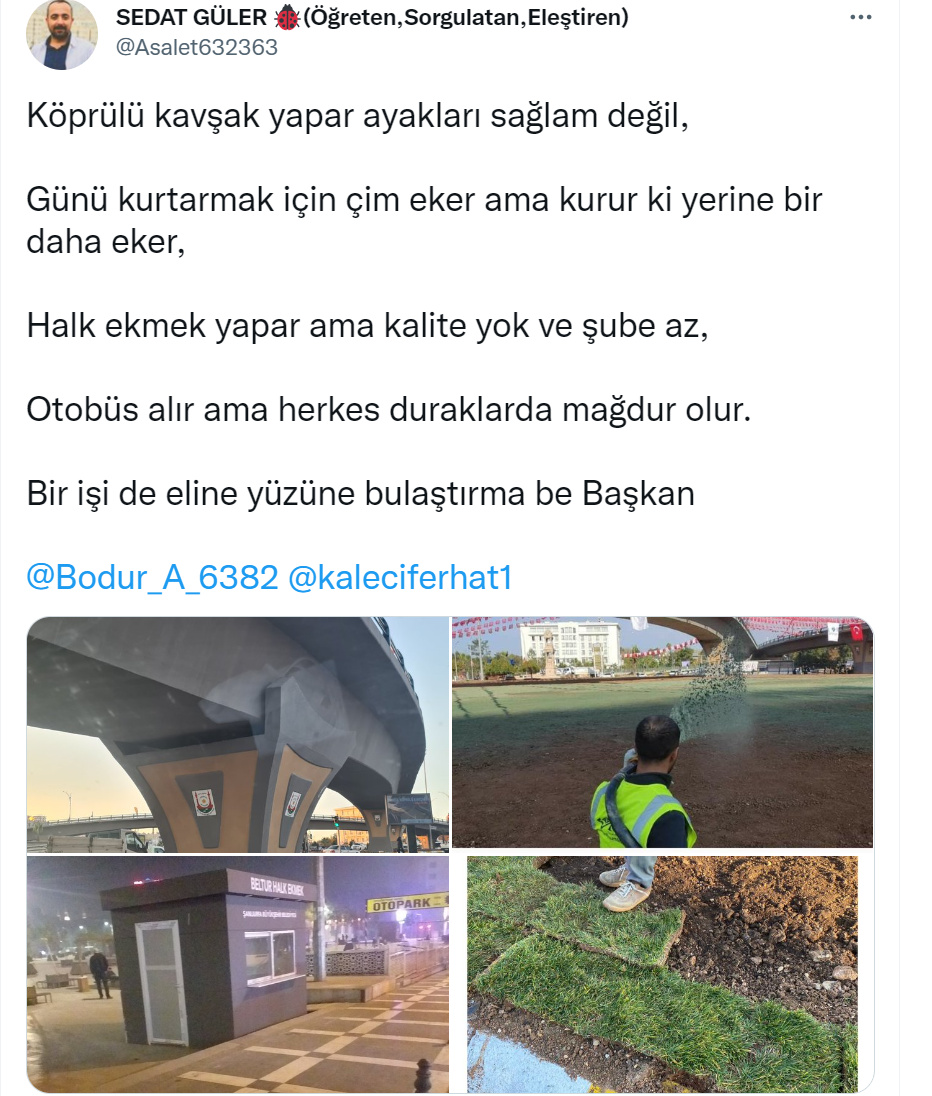 Şanlıurfa Büyükşehir Belediye Başkanı Zeynel Abidin Beyazgül, hatırlanacağı gibi Cumhurbaşkanı Erdoğanın Şanlıurfa mitingin deki göz boyama olarak eleştirilen Abide kavşagındaki toprağı yeşil boya ile çim varmış gibi göstermelik çalışmasıyla gündem olmuştu.