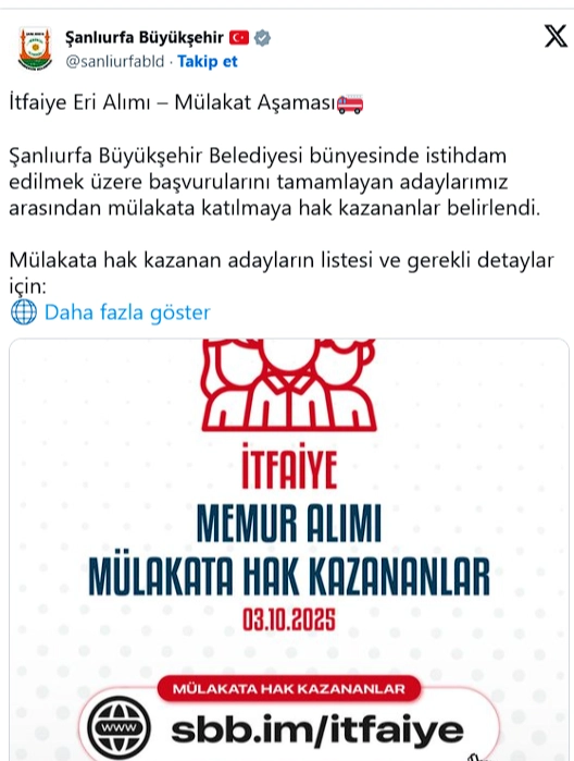 Mülakata katılmaya hak kazanan adayların listesi, Şanlıurfa Büyükşehir Belediyesi’nin resmi internet sitesi üzerinden duyuruldu. Adaylar, 20 Ekim 2025 tarihinde sözlü ve uygulamalı sınava girecek. Sınav, saat 09.30’da İtfaiye Dairesi Başkanlığı’nda gerçekleştirilecek.