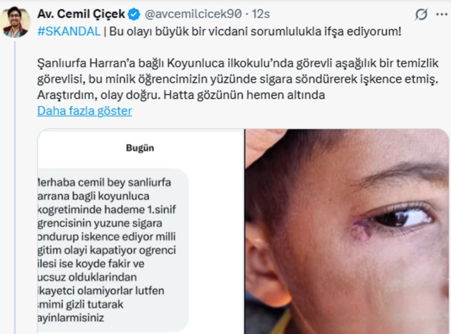 “Bu olayı büyük bir vicdani sorumlulukla ifşa ediyorum! Şanlıurfa Harran’a bağlı Koyunluca ilkokulu’nda görevli aşağılık bir temizlik görevlisi, bu minik öğrencimizin yüzünde sigara söndürerek işkence etmiş. Araştırdım, olay doğru. Hatta gözünün hemen altında söndürmüş! Aile fakir, güçsüz ve yoksul olduğu için şikayetçi olamamış. Bununla da kalmamış. Hademe, çocuğu dövmüş! Üstelik tehditler savurmuş. Ulan sen benim elime düştün! En ağır bedeli ödeyene kadar peşindeyim! Eğer sen adamsan beni de tehdit edersin! Bu çocuğumuz derhal koruma altına alınmalı! Koyunluca ilkokulundaki temizlik görevlisi meslekten derhal ihraç edilip tutuklanmalı!”