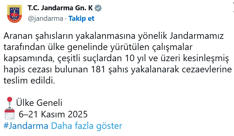 “Aranan şahısların yakalanmasına yönelik Jandarmamız tarafından ülke genelinde yürütülen çalışmalar kapsamında, çeşitli suçlardan 10 yıl ve üzeri kesinleşmiş hapis cezası bulunan 181 şahıs yakalanarak cezaevlerine teslim edildi.”