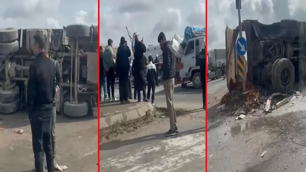 Çarpışma etkisi ile meydana gelen kazada 4 kişi yaralanırken, içerisinde toprak bulunan bir kamyon devrildi.