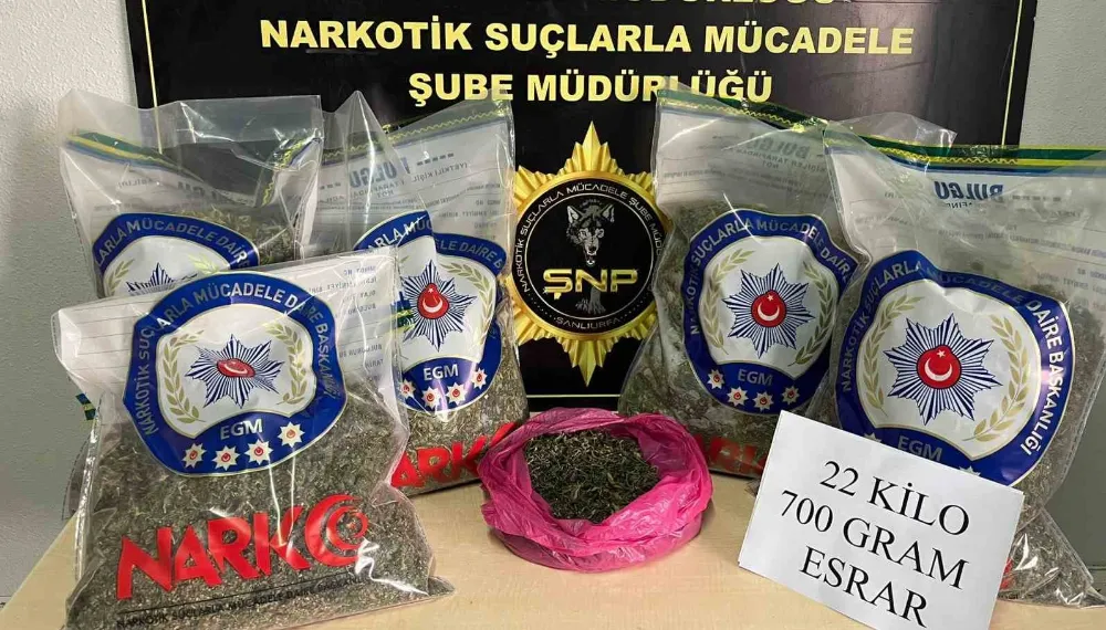 Şanlıurfa İl Emniyet Müdürlüğü Narkotik Suçlarla Mücadele Büro Amirliği ekiplerince, "uyuşturucu madde imal ve ticareti" suçuna yönelik çalışma yapıldı. Belirlenen adrese düzenlenen operasyonda 2 şüpheli gözaltına alınırken, adreslerde yapılan aramalarda 4 parça halinde 22 kilo 700 gram esrar maddesi ele geçirildi. Şüpheliler hakkında adli işlem başlatıldı.