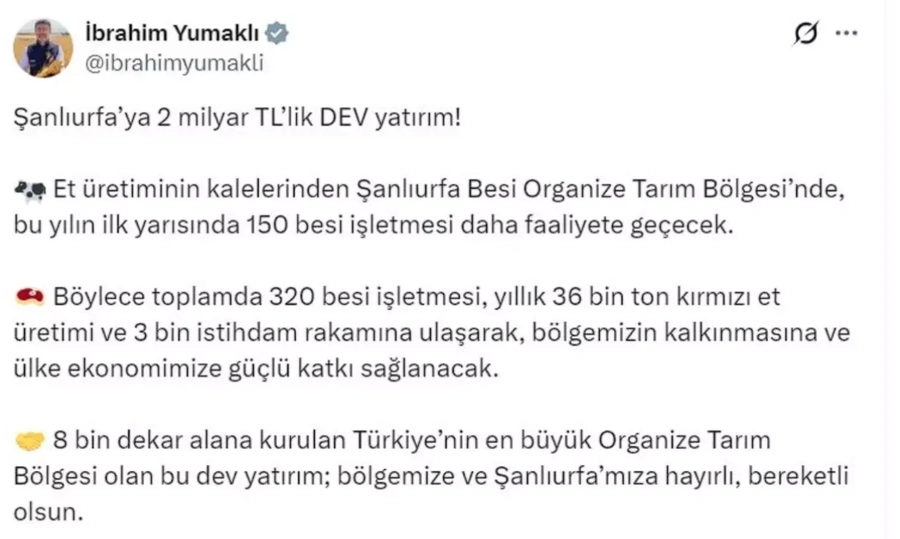 Bakan Yumaklı, sanal medya hesabından yaptığı açıklamada, "Şanlıurfa'ya 2 milyar TL'lik dev yatırım! Et üretiminin kalelerinden Şanlıurfa Besi Organize Tarım Bölgesi'nde, bu yılın ilk yarısında 150 besi işletmesi daha faaliyete geçecek.