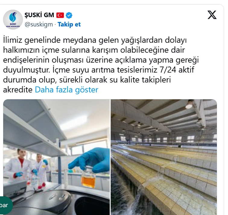 Şanlıurfa Su ve Kanalizasyon İdaresi (ŞUSKİ) Genel Müdürlüğü, sosyal medya hesabından şu açıklamalara yer verdi, “İlimiz genelinde meydana gelen yağışlardan dolayı halkımızın içme sularına karışım olabileceğine dair endişelerinin oluşması üzerine açıklama yapma gereği duyulmuştur.