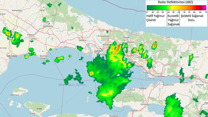Meteoroloji Genel Müdürlüğü`nden yapılan açıklamada, `İstanbul`un Avrupa yakasının güney kesimlerinde şiddetli sağanak ve lokal olarak dolu yağışı geçişleri tekrar başladı. Su baskını, yıldırım, yerel dolu yağışı, yağış anında kuvvetli rüzgar gibi olumsuzluklara karşı dikkatli olunmalıdır` denildi.